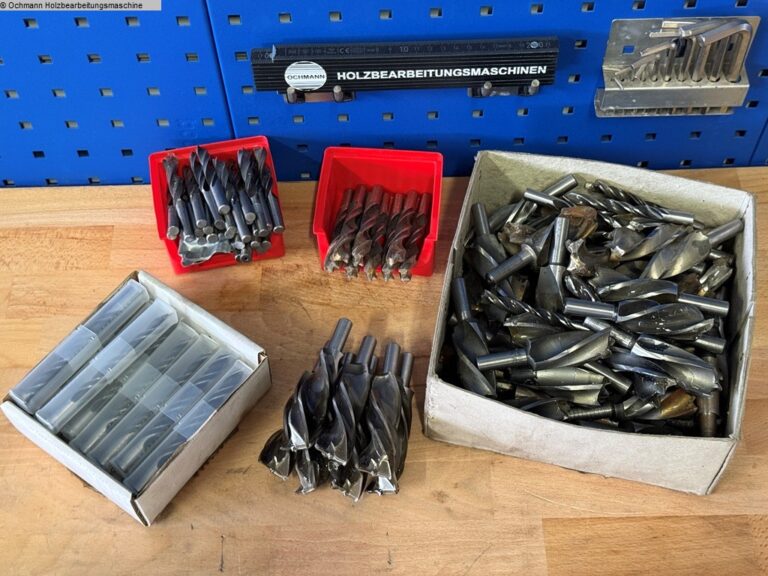 Posten neuwertige beziehungsweise neue und gebrauchte Holz Bohrer hauptsächlich in den Größen 10, 13 und 26 mm. Restposten eines Doppelendprofilers mit Bohraggregaten.