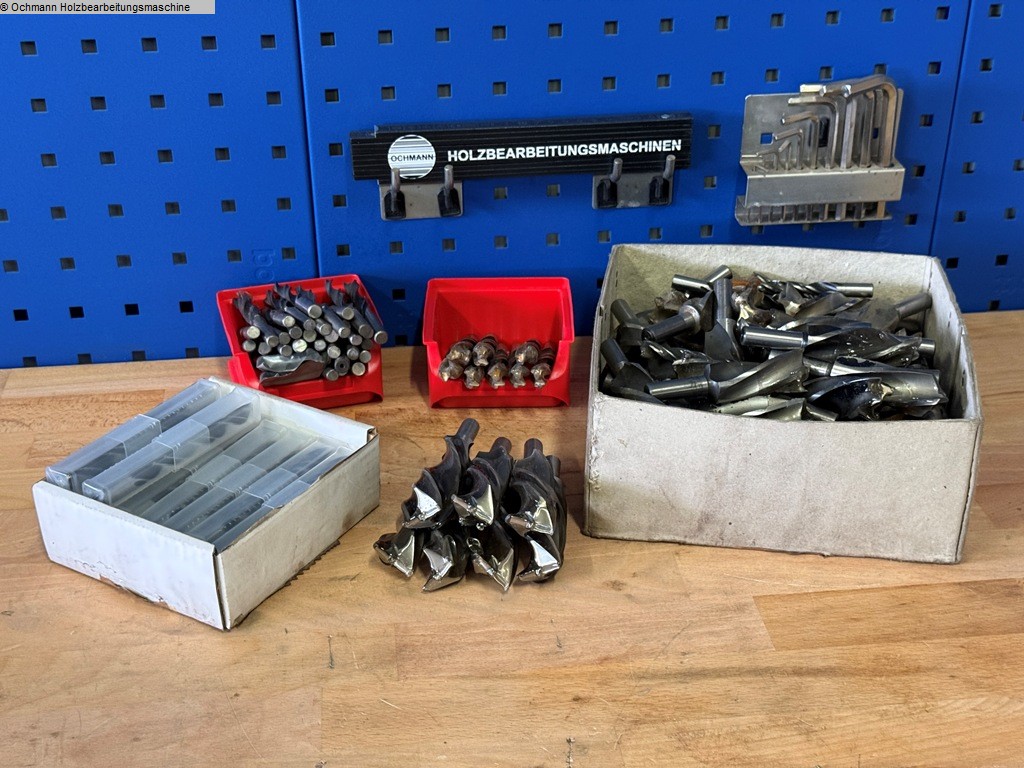 Posten neuwertige beziehungsweise neue und gebrauchte Holz Bohrer hauptsächlich in den Größen 10, 13 und 26 mm. Restposten eines Doppelendprofilers mit Bohraggregaten.