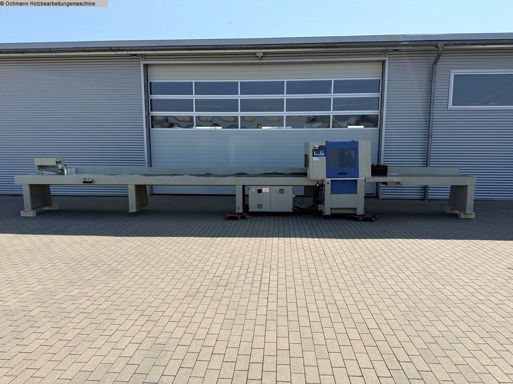 Automatische Optimierungskappsäge (Schiebersäge) Dimter Typ OptiCut 700 zum Kappen von sehr breiten Hölzern nach Fehlstellen (fluoreszierende kreide) und Längen.