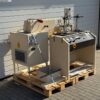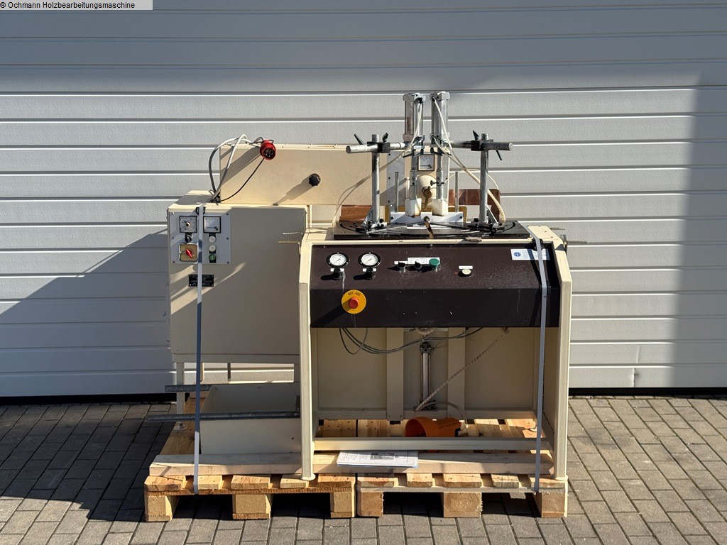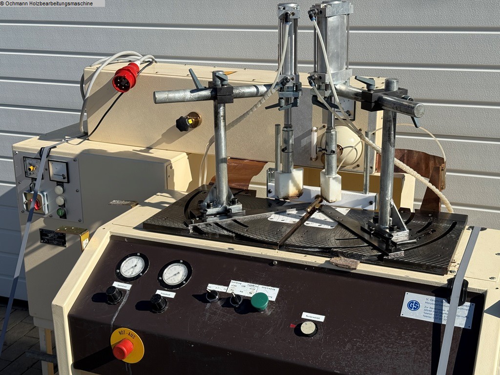 Gehrungs-Zusammensetz-Maschine Himmel Typ HF120 für das präzise und feste Verleimen von Gehrungsverbindungen in Holzrahmen, Sprossen und Leisten mit Weißleim. Die Maschine ermöglicht eine schnelle Abbindezeit durch Hochfrequenztechnologie, pneumatische Pressmechanismen und exakte Ausrichtung der Werkstücke. Ideal für den Möbel- und Bilderrahmenbau.