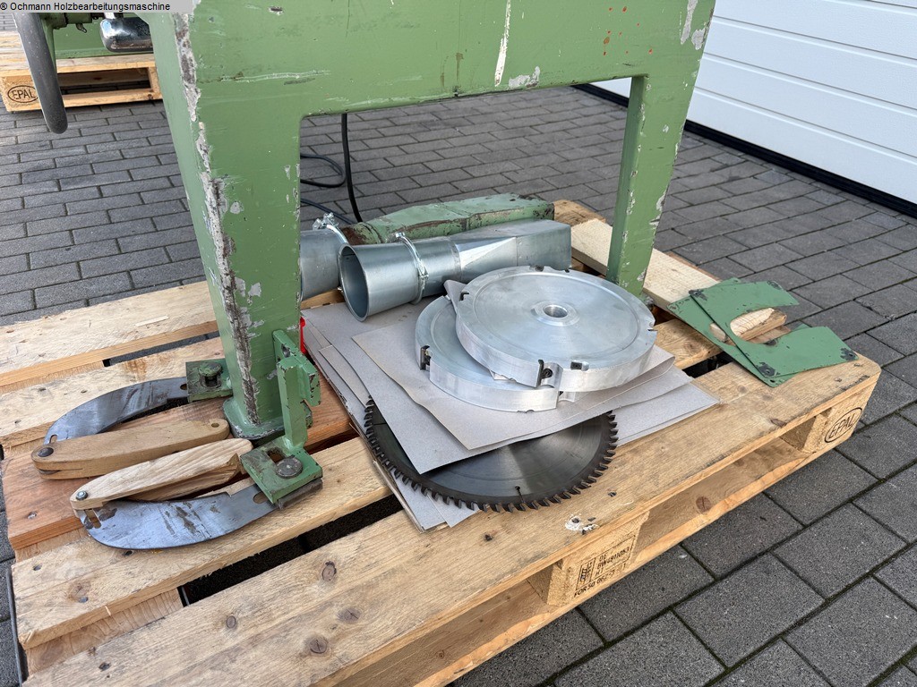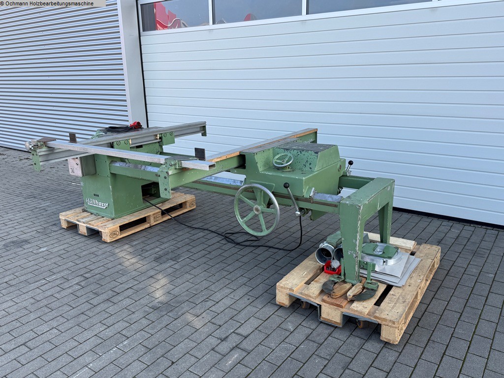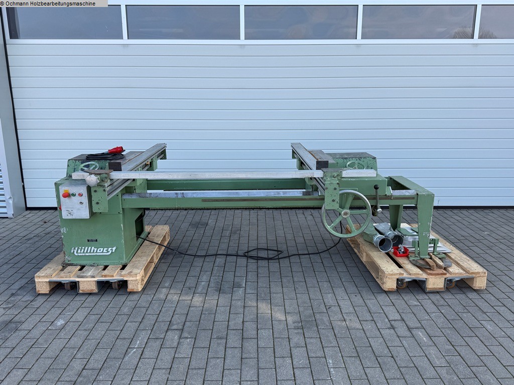 Doppelablängsäge Hüllhorst Typ DH zum beidseitigen, maßgenauen Ablängen von Hölzern und Platten. Die Maschine ermöglicht rationelles Arbeiten durch zwei gegenüberliegende Sägeaggregate und eine präzise Längenpositionierung.