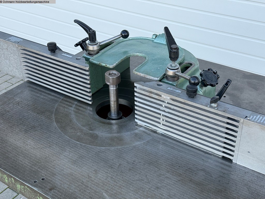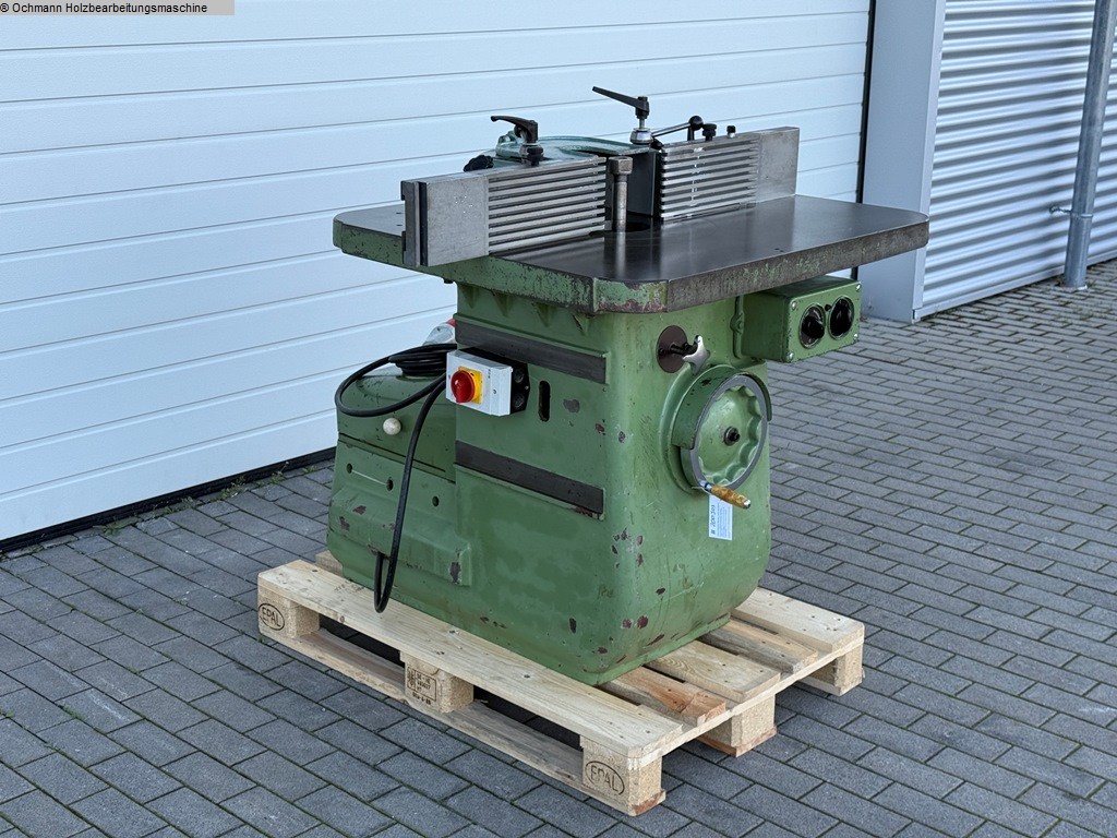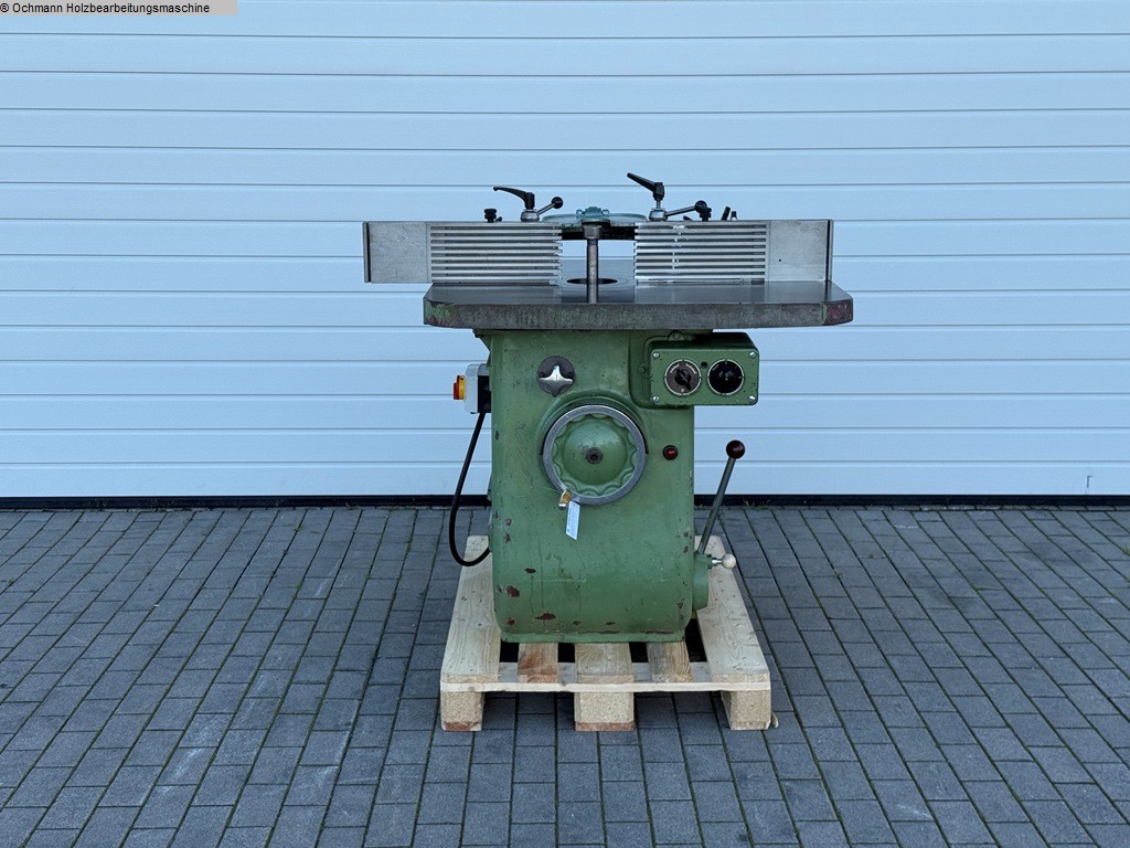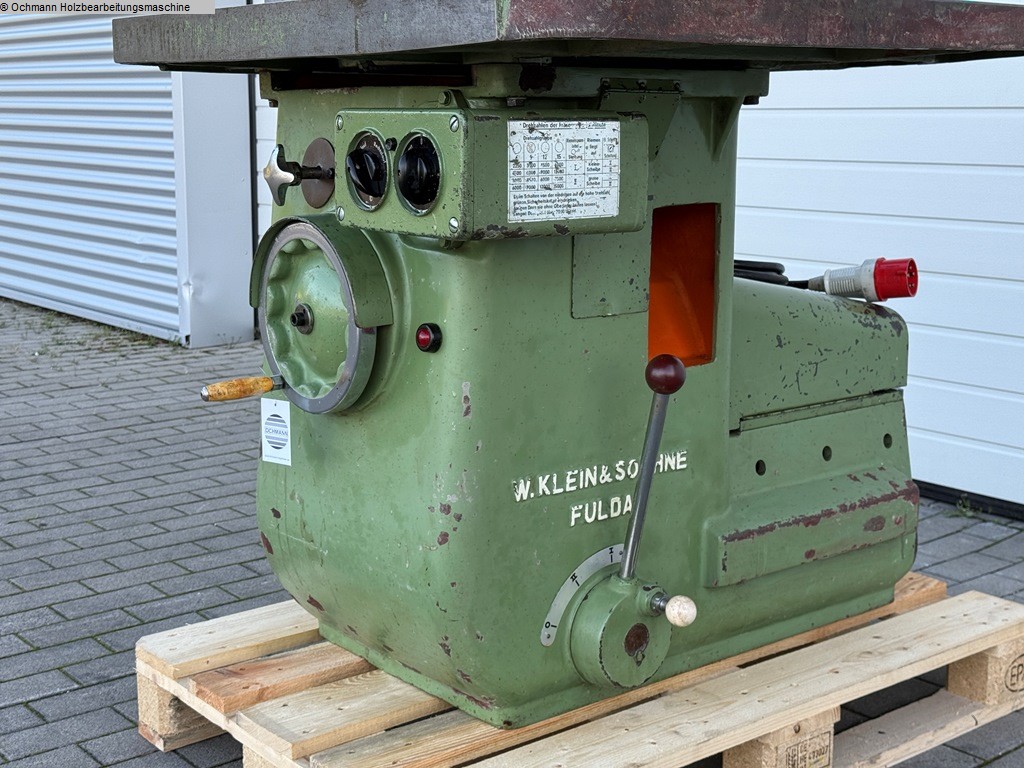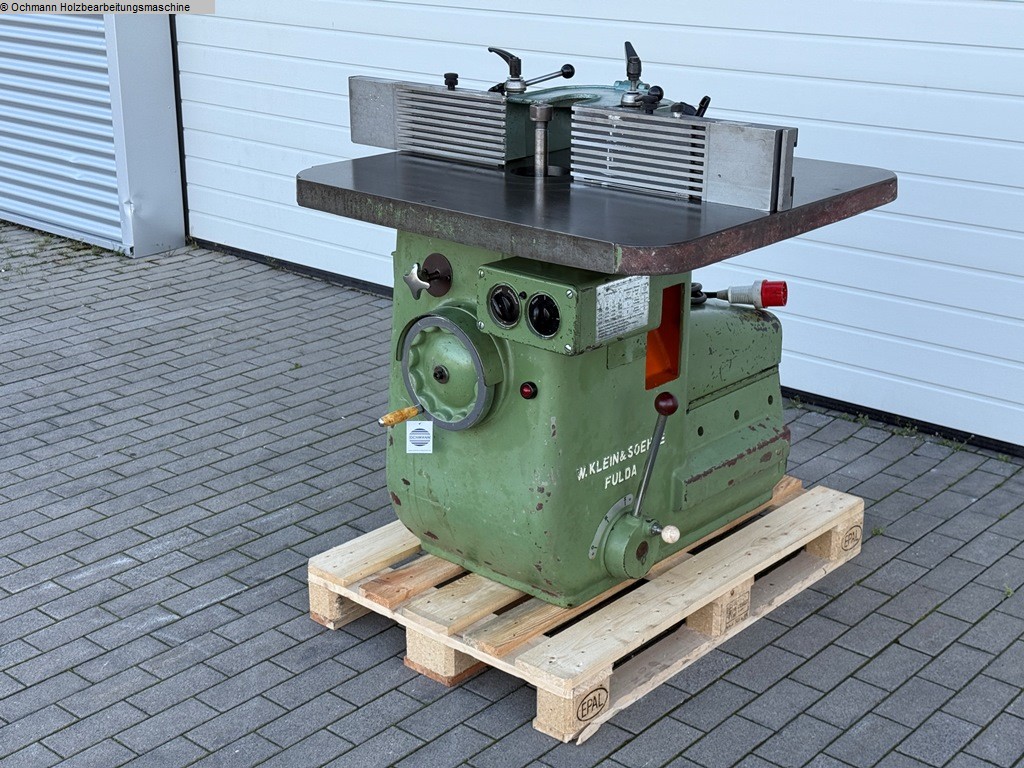 Eine Starre Tischfräse oder Starrfräse Klein + Söhne zum Profilieren und Fräsen von Hölzern, ausgestattet mit einem Aigner Integralanschlag.