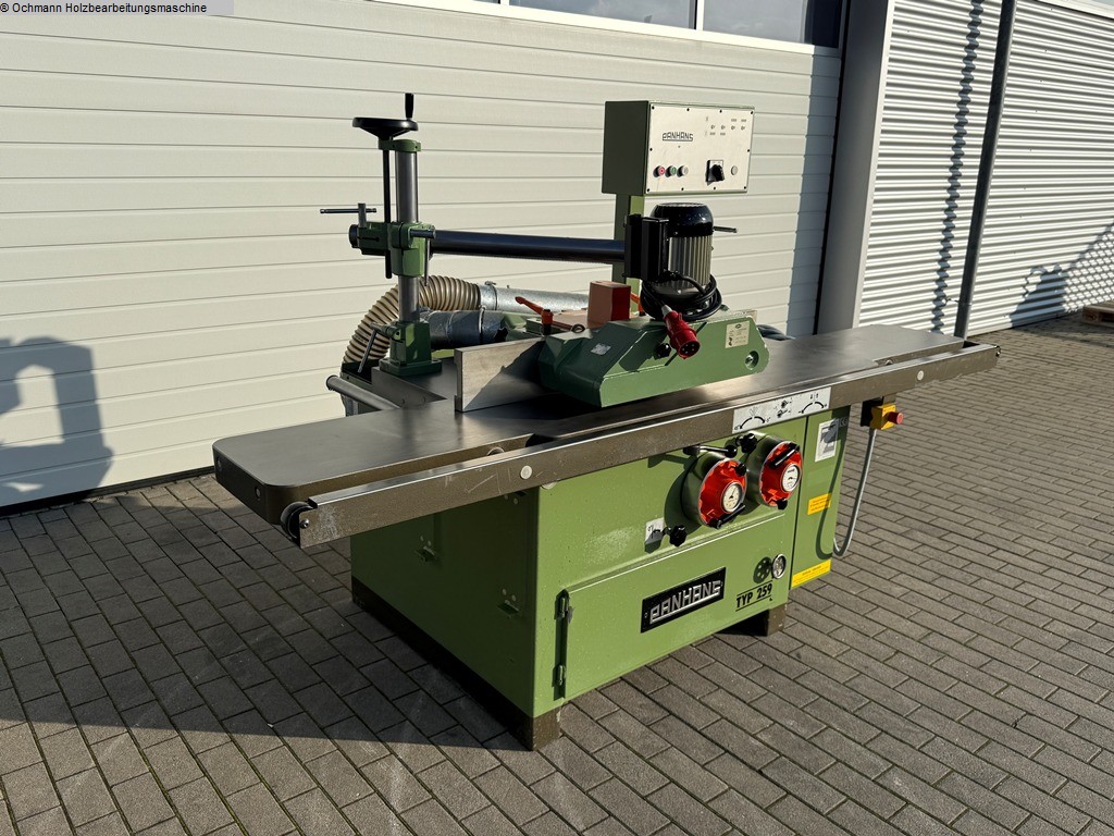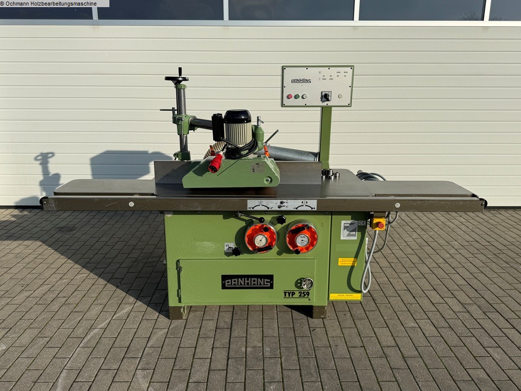 Schwenkspindelfräse oder Tischfräse Panhans Typ 259 zum präzisen Fräsen, Profilieren und Falzen von Massivholz und Holzwerkstoffen. Die Maschine verfügt über eine schwenkbare Frässpindel und ermöglicht dadurch vielseitige Bearbeitungen bei unterschiedlichen Winkeln. Ideal für Tischlereien, Möbelbau und Innenausbau. Inklusive Vorschubapparat Haffner.