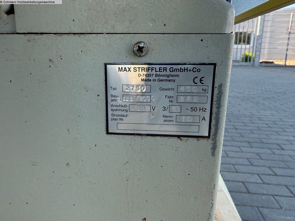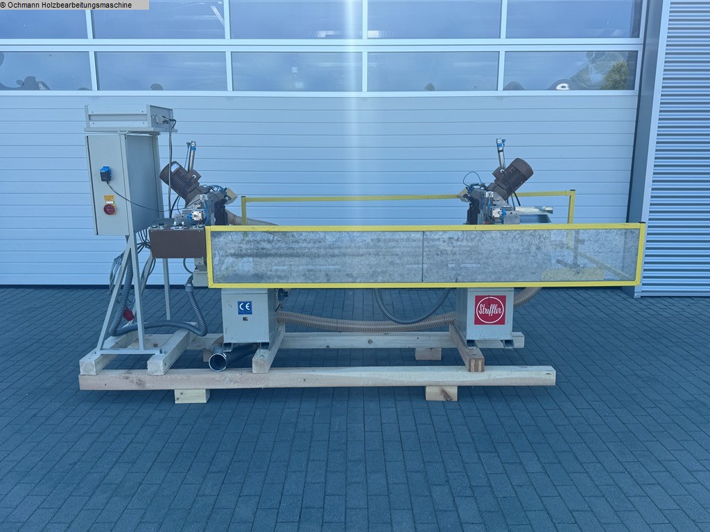 Doppelgehrungskreissäge Striffler Typ 2750-E für präzise Gehrungs- und Kappschnitte in Holzprofilen, Leisten und Rahmen. Die Maschine eignet sich ideal für die Serienfertigung im Fenster-, Türen- und Möbelbau durch zwei pneumatisch schwenkbare Sägeaggregate und elektronische Positionierung.